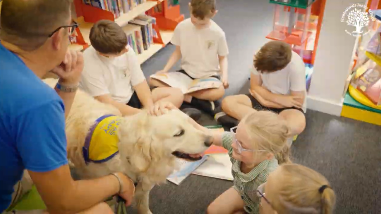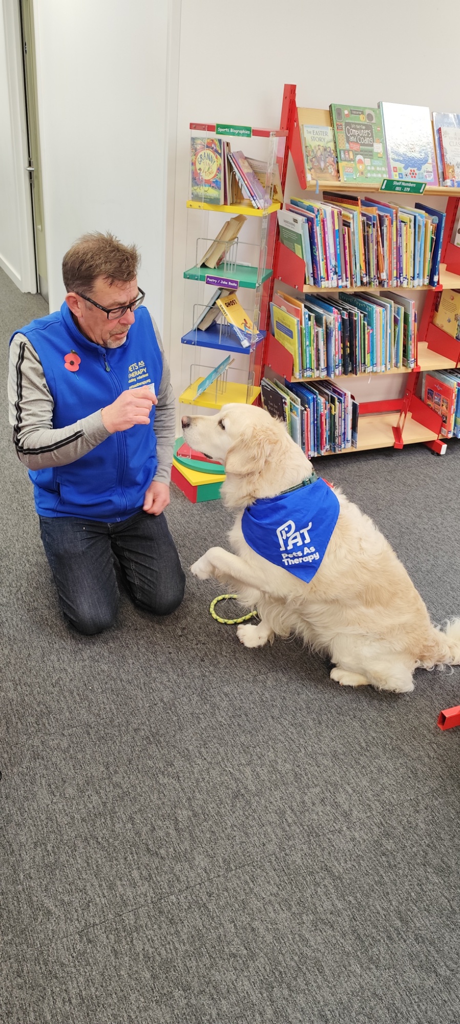 Peggy helps the children feel more confident in their reading, and she presents as a quiet presence for the children, acting as a source of comfort and a tool for building trust and improving communication, which helps to develop overall emotional and social wellbeing.
