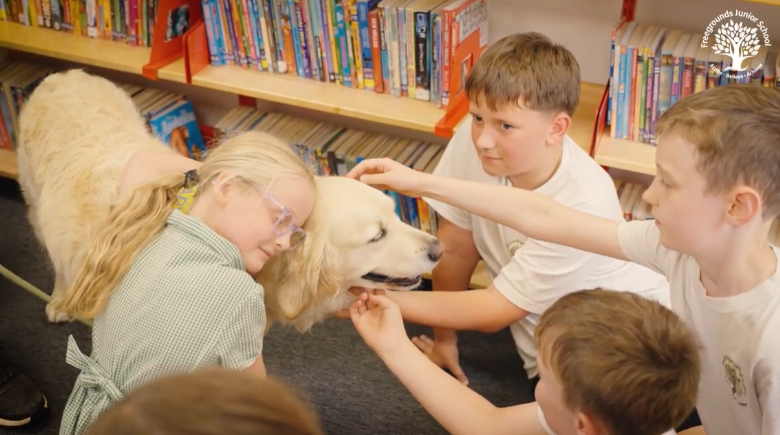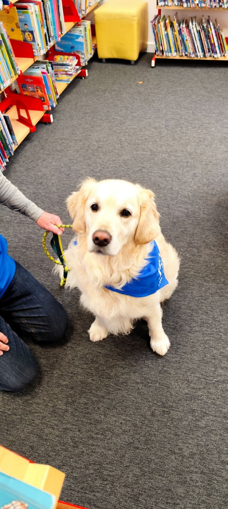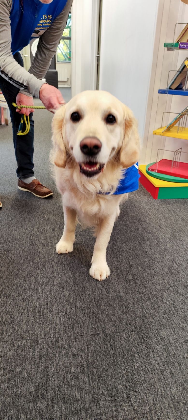 We are so lucky to have Peggy the Therapy Dog join us in school each week! Peggy is a trained therapy dog who has been a regular visitor to Freegrounds for a couple of years now, and she loves coming to visit the children and hear them read to her. Peggy is joined by her wonderful owner, Guy and, every week, they spend the afternoon at our school listening to small groups of children read out loud along with the school librarian – Mrs Whettingsteel.